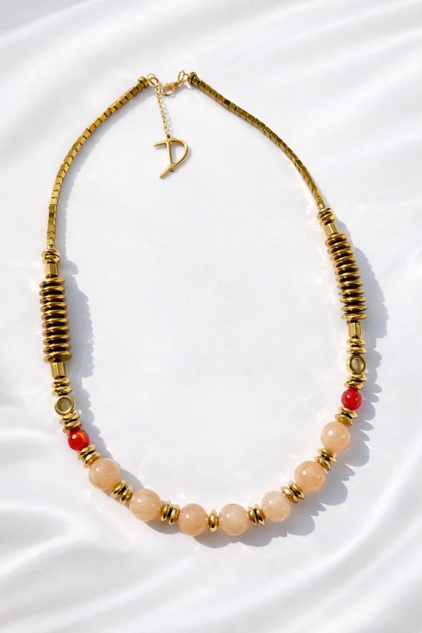 A refined balance of beige stones ,gold and two agate accents Minimal , intentional and timelessly elegant